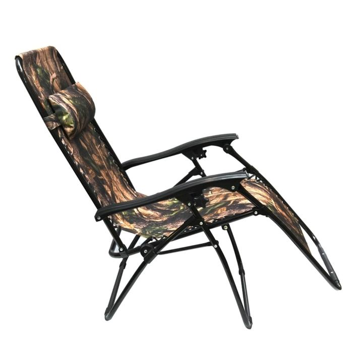 Desainnya yang ergonomis dengan pola kamuflase hutan (camo) berwarna hijau-cokelat memberikan tampilan rugged yang menyatu dengan alam, sementara bingkai logam hitam yang kokoh memastikan kestabilan dan portabilitas. Kursi ini dapat disesuaikan ke posisi rebah (zero-gravity) untuk kenyamanan maksimal, dilengkapi bantal kepala empuk dan sandaran lengan yang nyaman. Mudah dilipat dan dibawa, cocok untuk petualangan outdoor atau penggunaan sehari-hari di halaman rumah.
